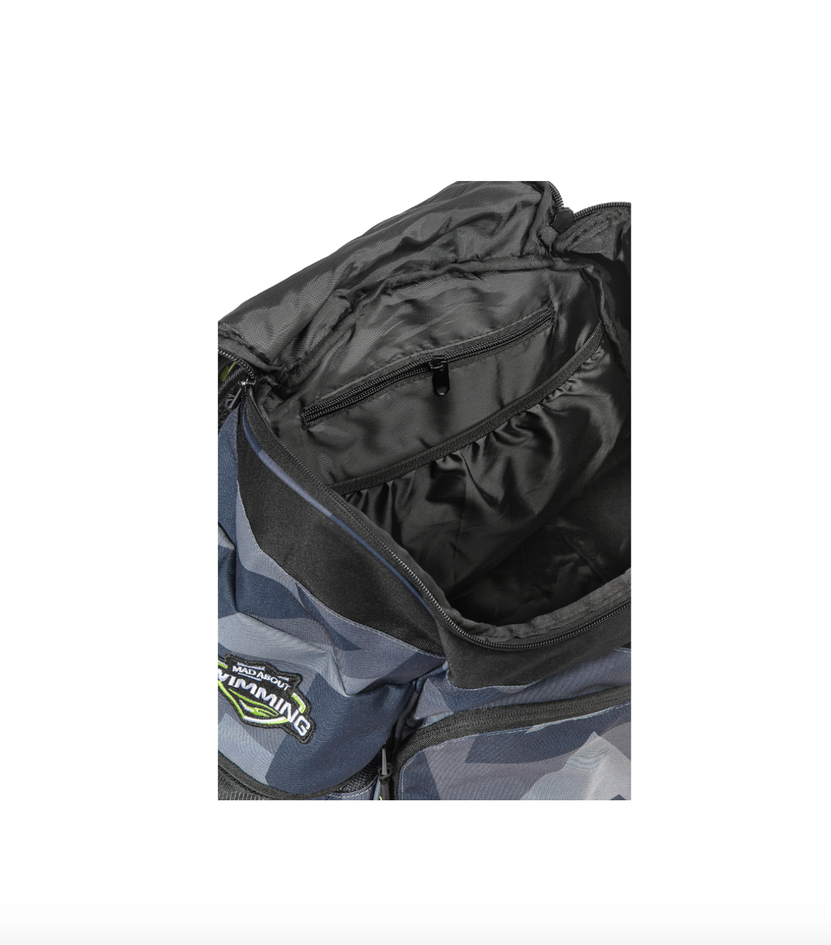 - Det store centrale rum er praktisk til alle dine større svømmeremedier du skal have med, håndklæde, svømmefødder, fingerplader med mere. I det store rum finder du også et adskilt rum med lynlås, som kan holde dit elektronik, pung, nøgler med mere tørt og sikkert. Op mod ryggen i det store rum finder du også et rum med mesh opdeling. Dette rum er praktisk til opbevaring af papir, tynde mapper eller ligende.