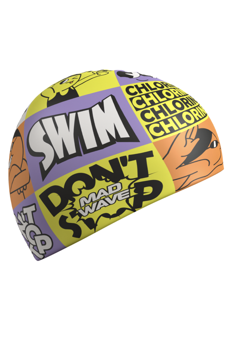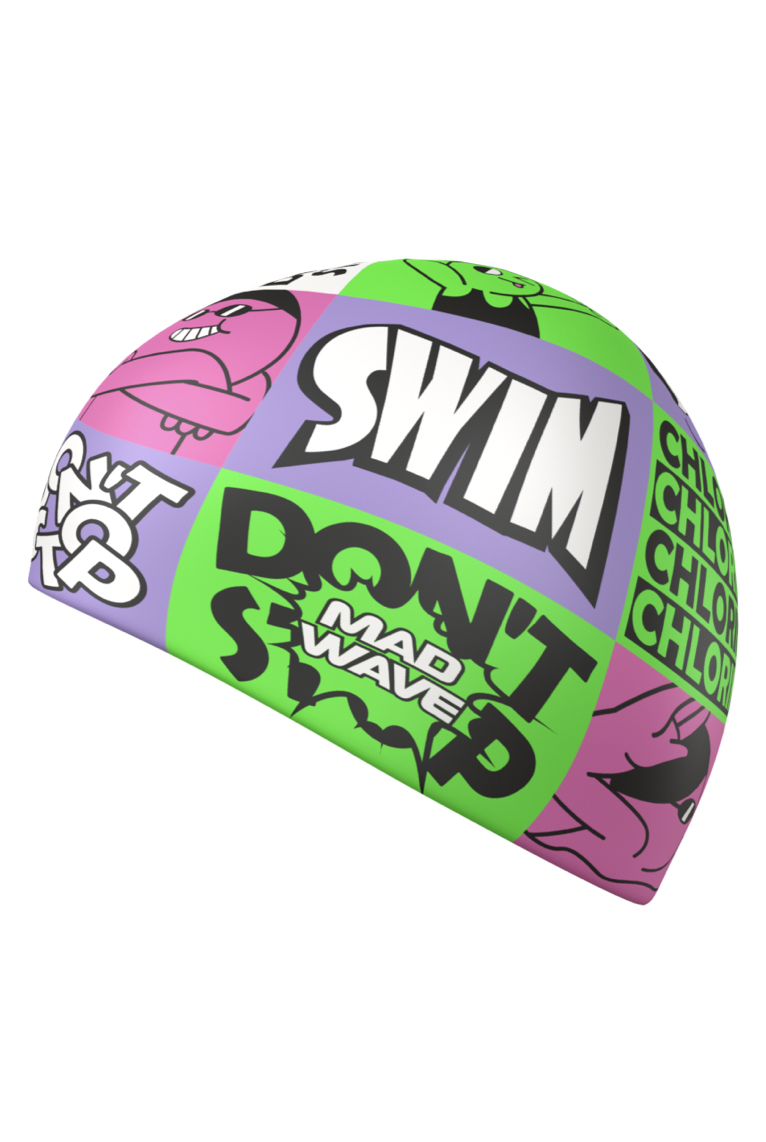NON – Stop er en sjov og farveri badehætte til børn, som opfordre til at blive ved med at svømme og have det sjovt med sporten.