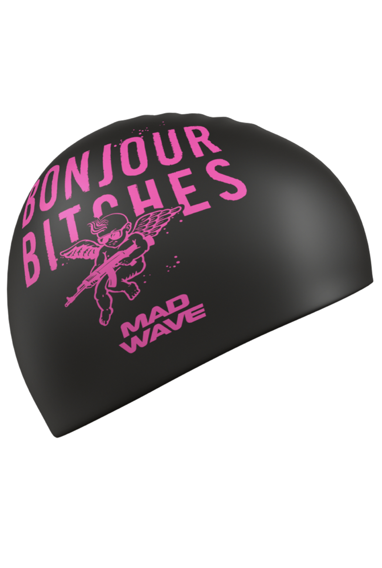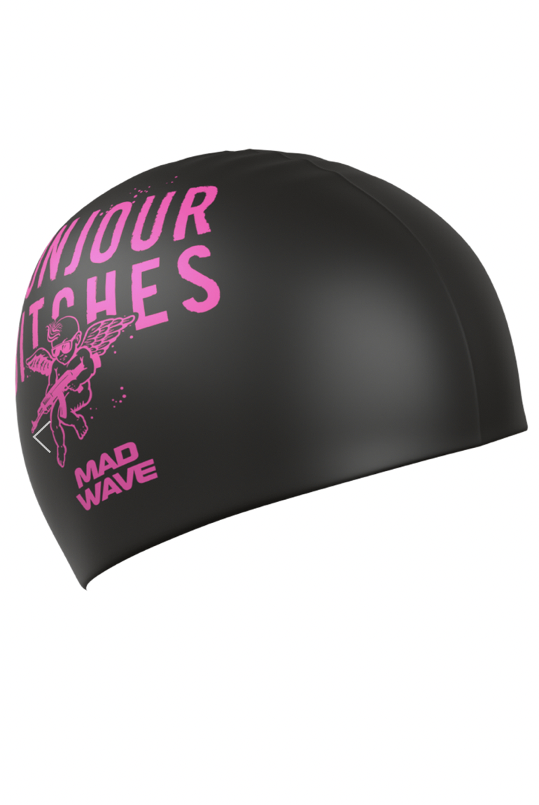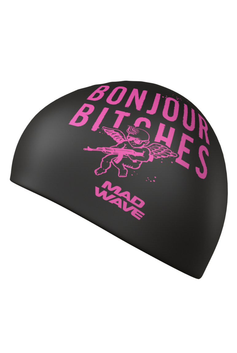 Super flot badehætte med et rigtigt tøse design på i sort og pink……. eller hvem tør at have den på – Bonjour Bitches.